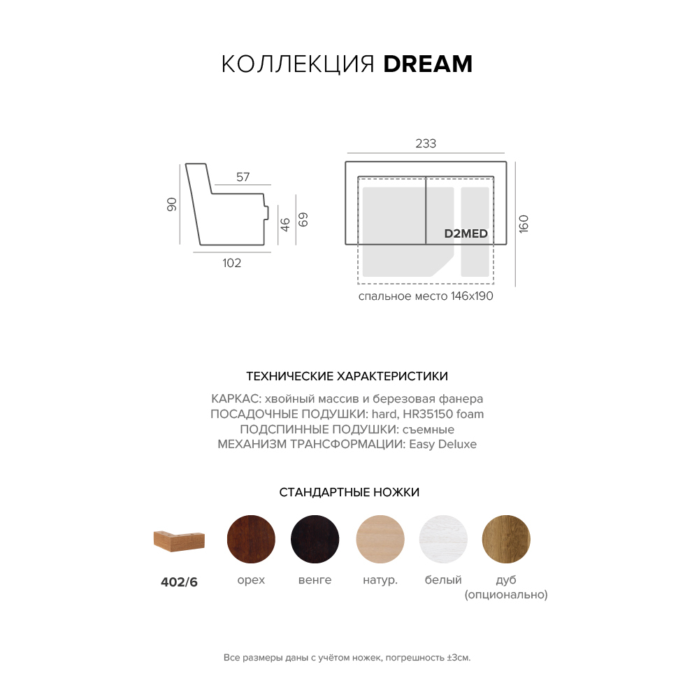 Сдержанная конструкция и строгая геометрия сочетаются в этой модели с ироничным расположением подспинных подушек. Оригинальный ход – расположить съемные подушки внахлест в направлении к центру – сразу обращает на себя внимание. Широкие подлокотники придают основательность модели и служат удобной опорой. Лаконичный диван впишется в интерьер гостиной или гостевой комнаты в современном стиле. DREAM оснащен удобным механизмом трансформации спального места шириной 146 см. Простой и надежный способ раскладывания позволит создать комфортное спальное место на каждый день.
