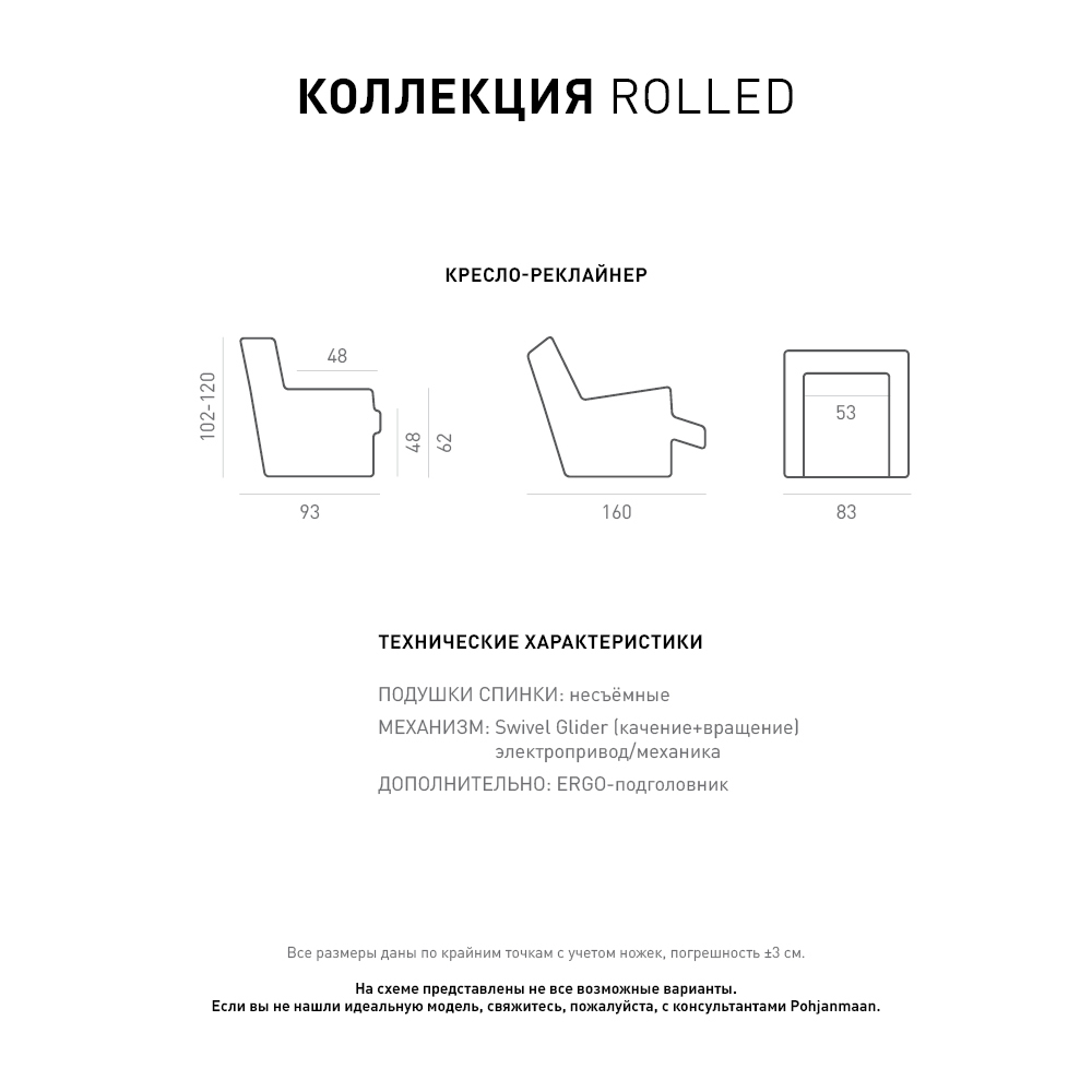 Перед нами классическое кресло с подлокотником в форме «завитка», но дисковое основание намекает, что модель не так проста. За элегантным образом домашнего кресла скрывается технологичная «начинка». Одним движением конструкция плавно достигает 160 см, приводя сидящего в положение полулёжа. Спинка отклоняется, а нижняя панель трансформируется в подставку для ног. Верхний ярус спинки — регулируемый подголовник. Пропорции подчёркнуты кантом, который «следует» за меняющейся формой предмета. Кресло-реклайнер ROLLED обладает всеми качествами и функциями, необходимыми в деловой обстановке кабинета. Пара кресел размера L превращает гостиную в домашний кинозал, а в детской и у камина пригодится функция качания. Кресло подойдёт в скандинавские, современные американские и английские интерьеры. Опционально основание реклайнера и рычаг могут быть выполнены из высокопрочной стали.