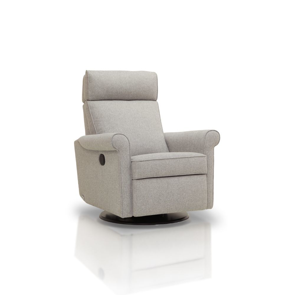 Реклайнер c механизмом качания и вращения на 360° установлен на опору из черного МДФ. Кресло трансформируется механически (рычаг или кнопка) или с помощью электропривода, аккумулятора. Качание происходит по инерции. Опционально устанавливается функция фиксации GLIDER LOCK. Высота и наклон подголовника регулируется вручную. Кресло выдерживает до 115 кг. В коллекции представлены две модели: среднего (M) и большого (L) размера.