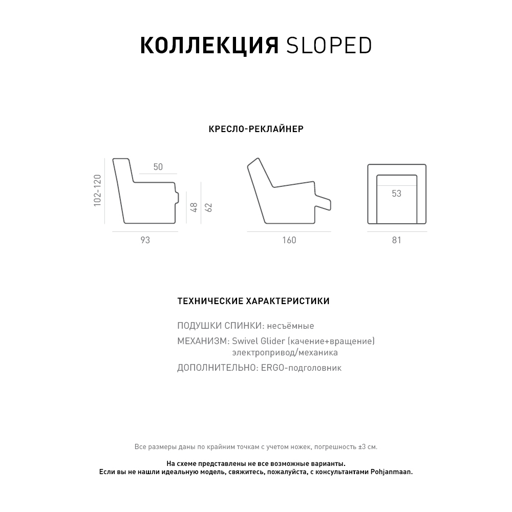 Характерные черты SLOPED — отсутствие острых углов, выступающий край сиденья и неширокие подлокотники. Форма следует за функцией, поэтому реклайнер выглядит гармонично в любом положении. Выступающая подушка сиденья не только обеспечивает оптимальную глубину. Вместе с «удвоенной» спинкой они создают образ по-домашнему мягкого кресла. Благодаря узким подлокотникам и высокой спинке модель не выглядит тяжелой. SLOPED станет олицетворением комфорта в современных интерьерах с элементами из стекла, металла, цветного пластика. Кресло поддержит стиль высоких технологий, тенденцию минимализма в скандинавских интерьерах. В спинке и сиденье использован высокоэластичный пенополиуретан, произведённый в Финляндии. Полотно из синтетического полиэфирного волокна создаёт аккуратный контур. Легкий, влагостойкий и нетоксичный материал быстро восстанавливает форму. Опционально основание реклайнера и рычаг могут быть выполнены из высокопрочной стали.