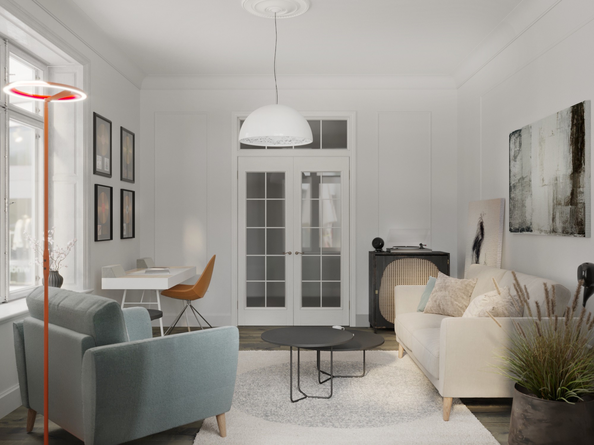 «Гостиная вместе с Hauska» находится в доме исторической застройки в тихом центре города. Гостиная с двумя окнами всегда залита светом. Пространство спроектировано и оформлено для проведения «квартирников», на которых гости наслаждаются прослушиванием музыки на виниле под бокал вина. В гостиной также предусмотрена зона home office. Зона общения и отдыха организована двухместным диваном и креслом коллекции Aria. Компактность и лаконичность выбранных моделей оставляет пространство свободным и комфортным для передвижения. Гостиная укомплектована двухместным диваном и креслом коллекции Aria. В связи с тем, что данная гостиная не предполагает ночной сон, модели подобраны без раскладного механизма. Диван выполнен в лаконичном бежевом цвете. Кресло оформлено в гармоничном лазурном оттенке и ткани более мягкой фактуры. Лазурный тон интересно играет с элементами оранжевого цвета и придает всему интерьеру сочность.