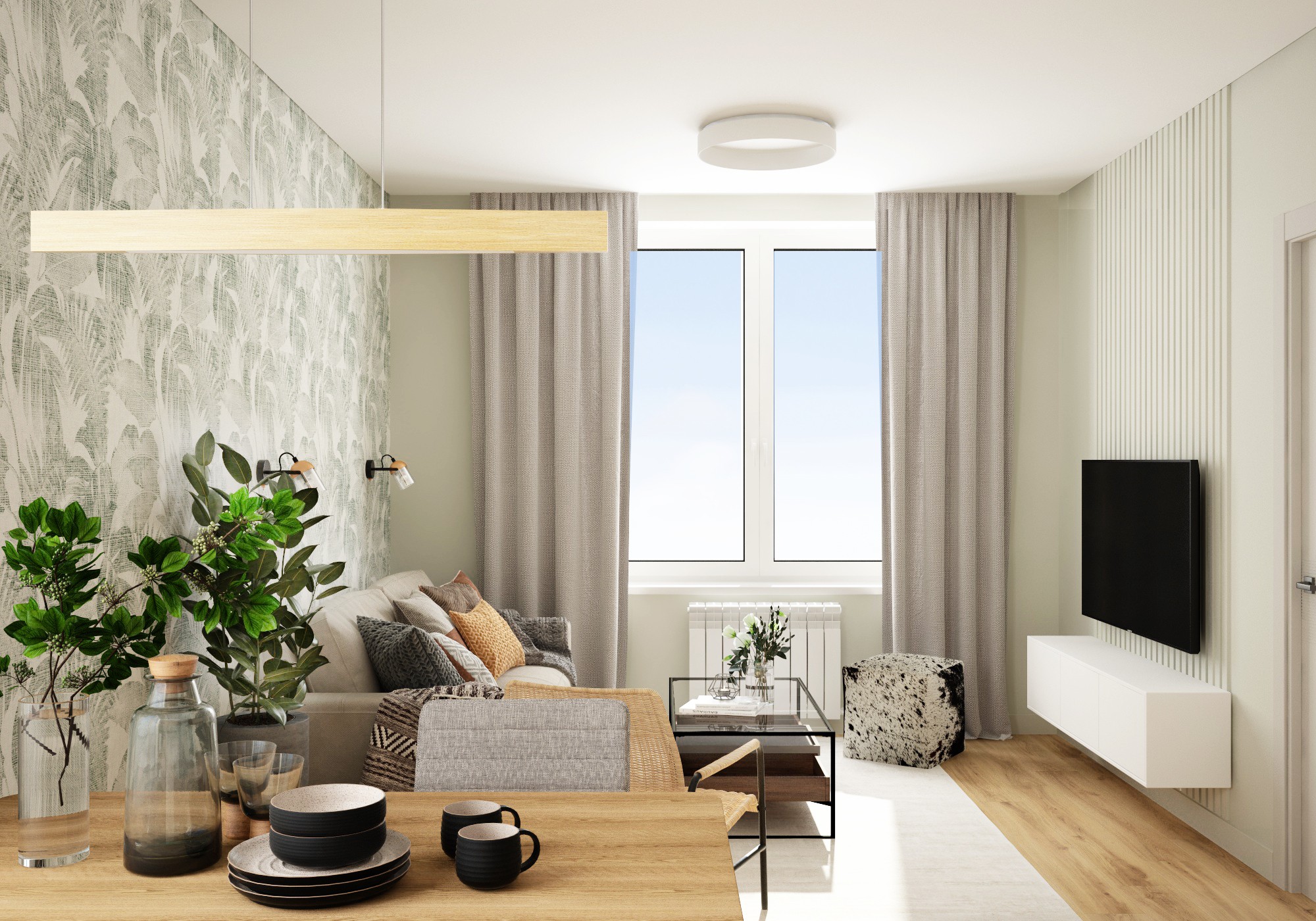Планировка от застройщика была максимально не функциональной, но за счет совсем несложной перепланировки удалось создать удобное пространство, выделить зону прихожей, хозяйственный блок под стиральную машину, гардеробную, перенесли спальню подальше от входа. В квартире будет жить девушка, молодая и активная, любящая путешествия и свою работу. Необходимо было создать просторную, светлую квартиру с южным, свежим настроением, так появились листья на стенах, плетеное кресло и ковер из джута в спальне. По моему, все удалось.